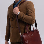 Der Schultergurt aus Vollleder ist breit und verfügt über eine polierte silberne Schnalle.